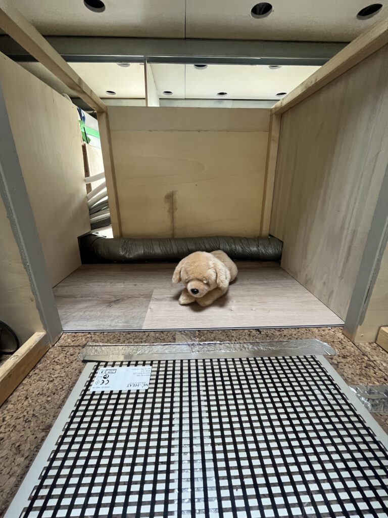 In der zukünftigen Hundehöhle unter dem Bett hat sich bereits jemand eingelebt bzw. probegelegen 🙂