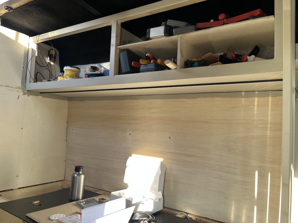 – unsere ausziehbare Bank/“Notschlafplatz“ für eine dritte Person hat einen neuen Fuß bekommen. Gestrichen ist er auch bereits.