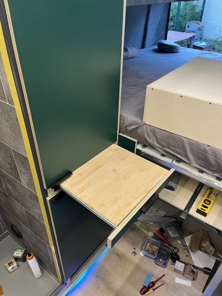 Eine ausziehbare Arbeitsfläche! Hier sieht man auch wie toll die Bambusplatte und die Moosgrüne Front zusammenpasst.