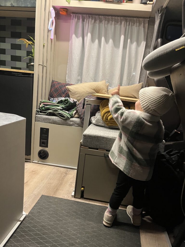 sondern auch die Abgrenzung zwischen Fahr- und Wohnbereich, Schlaf- und Wohnbereich sowie die beiden seitlichen Fenster/Schiebetür wurden mit Vorhängen versehen.